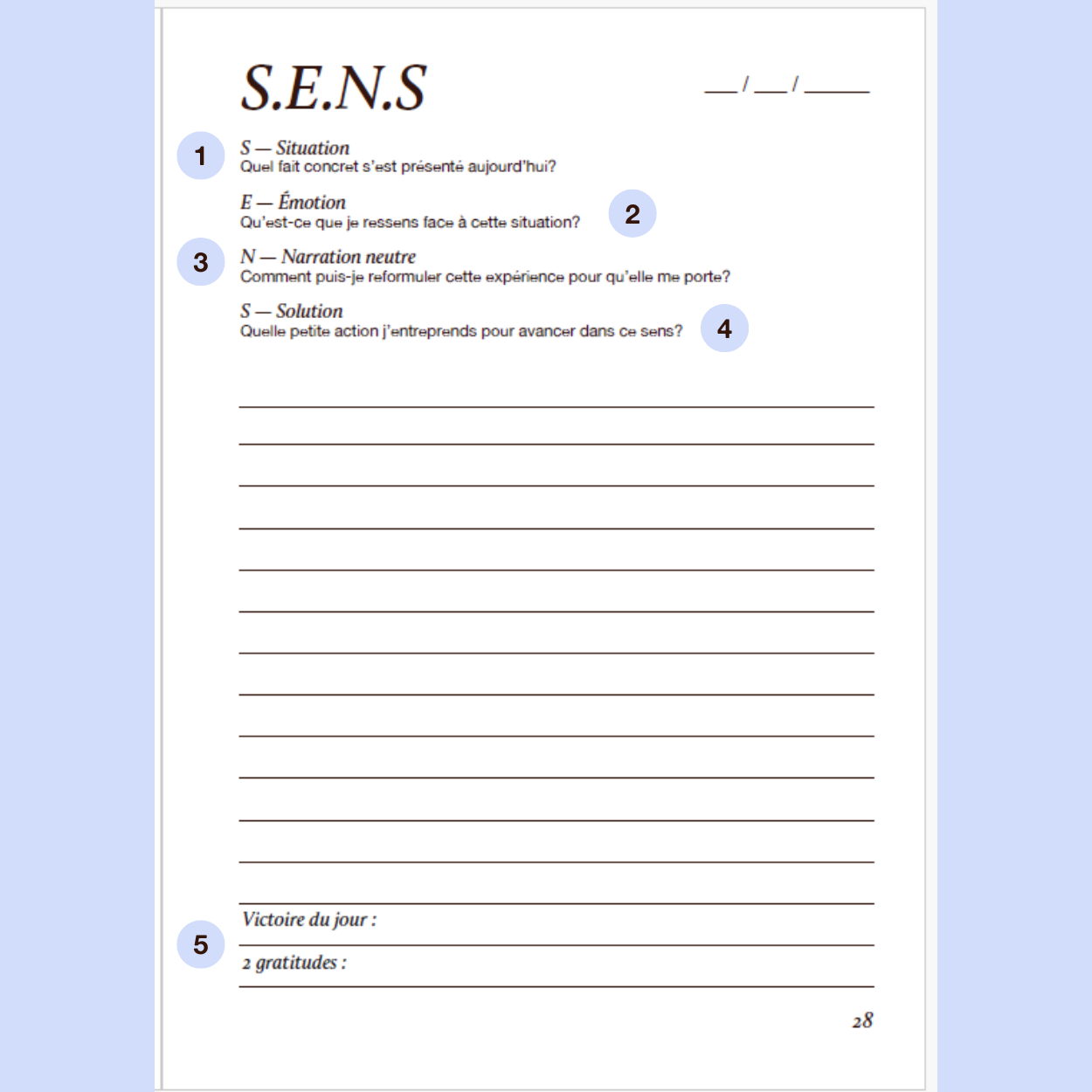 Au début, je pensais que ce serait “juste un carnet”. Mais la structure est redoutablement efficace. Dès que je commence à ruminer, je prends mon journal. J'apprends à mieux vivre avec les aléas de la vie.